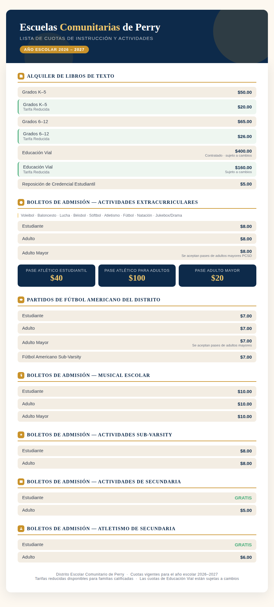 The district's list of fees was approved at the school board meeting on Monday, April 14th. The following fee schedule will be in effect right away.
